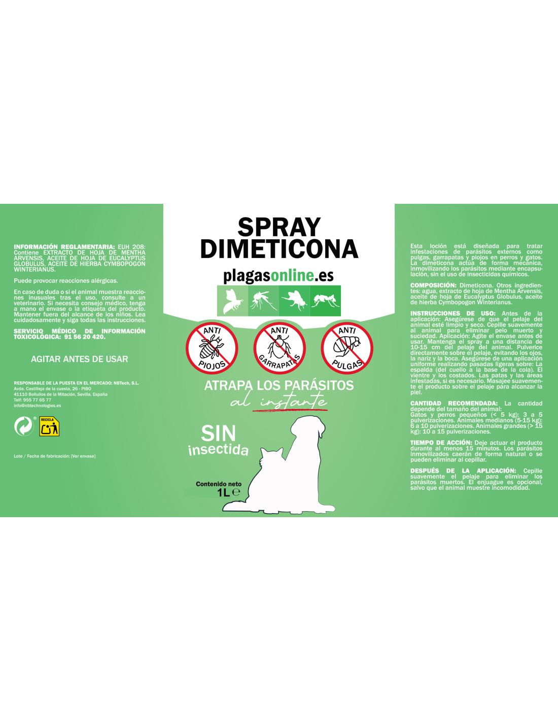 INSTRUCCIONES DE USO: Antes de la aplicación: Asegúrese de que el pelaje del animal esté limpio y seco. Cepille suavemente al animal para eliminar pelo muerto y suciedad. Aplicación: Agite el envase antes de usar. Mantenga el spray a una distancia de 10-15 cm del pelaje del animal. Pulverice directamente sobre el pelaje, evitando los ojos, la nariz y la boca. Asegúrese de una aplicación uniforme realizando pasadas ligeras sobre: La espalda (del cuello a la base de la cola). El vientre y los costados. Las patas y las áreas infestadas, si es necesario. Masajee suavemente el producto sobre el pelaje para alcanzar la piel.