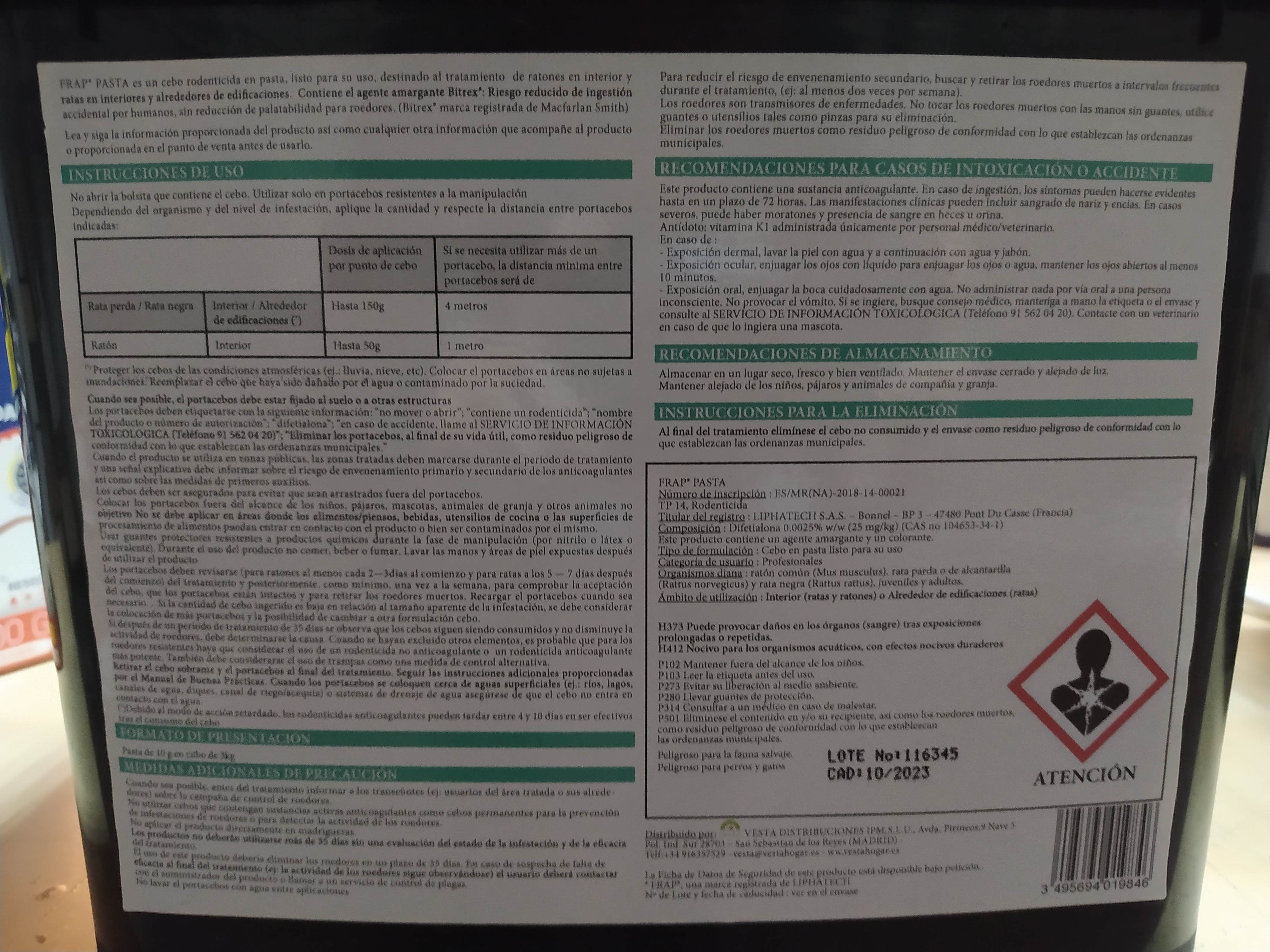 Número de Inscripción FRAP PASTA: ES/MR(NA)-2018-14-00021 TP 14, Rodenticida.
